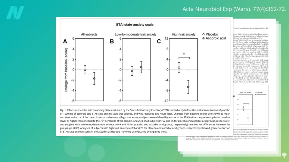 Given these data showing that vitamin C may have an anxiety-reducing effect, researchers sought to find out if a single dose could acutely affect emotional states. And indeed, within only two hours of taking some vitamin C, study participants experienced a significant drop in anxiety compared to placebo, though only among those who started out the most anxious in the first place, as you can see below and at 2:42 in my video Do Vitamin C Supplements Help With Anxiety?.