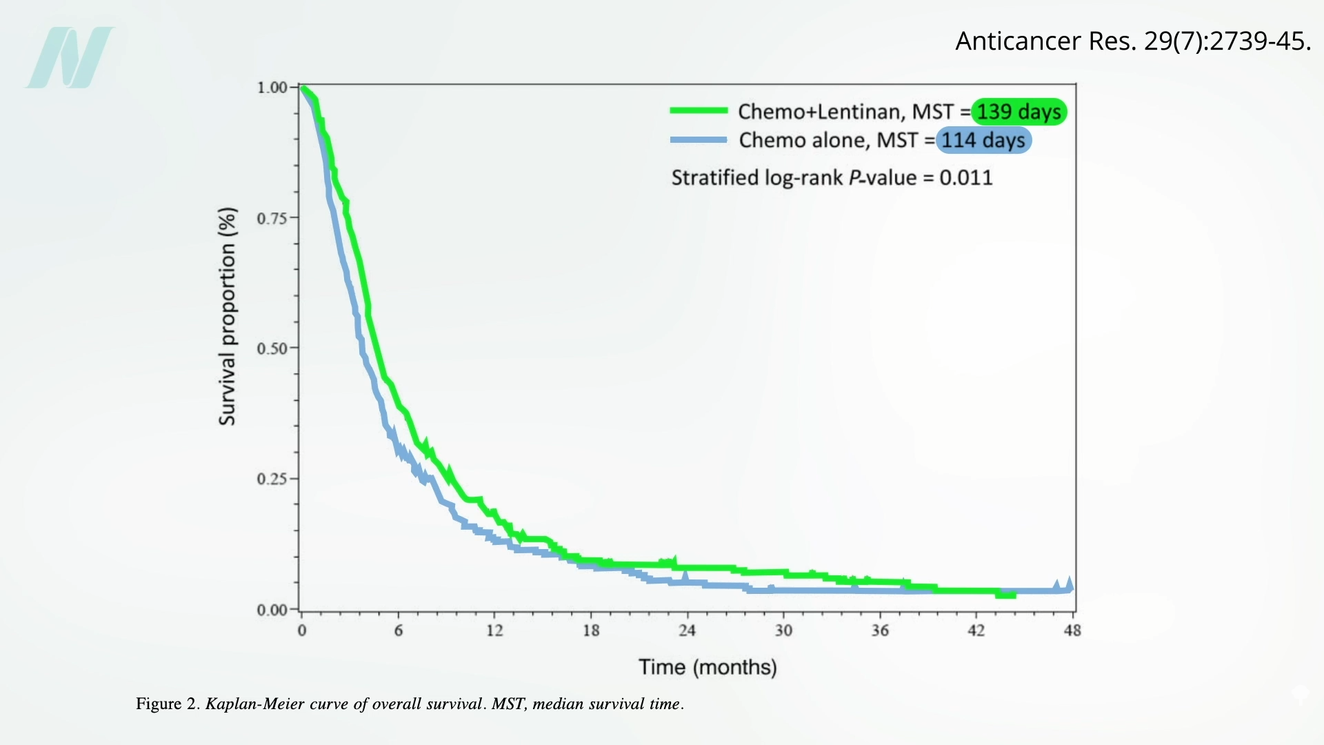 A compilation of 17 actual human clinical studies did find improvements in one-year survival in advanced cancer patients but no significant difference in the likelihood of living out to two years. Even the compilations of studies that purport that lentinan offers a significant advantage in terms of survival are just talking about statistical significance. As you can see below and at 2:15 in my video White Button Mushrooms for Prostate Cancer, it’s hard to even tell these survival curves apart.
